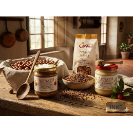 Un tris d'excellence combinant la florule grillée de pâtes usines Corona à la douceur raffinée des miels Apinath.