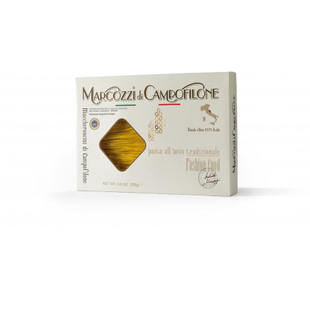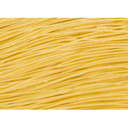 Questa pasta all'uovo, unica per la sua sfoglia sottilissima, viene realizzata esclusivamente con semola di grano duro 100% italiano e uova fresche, senza l'aggiunta di acqua.